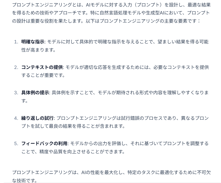 では、プロンプトエンジニアリングとはどのような内容なのか、生成AIに聞いてみたいと思います。