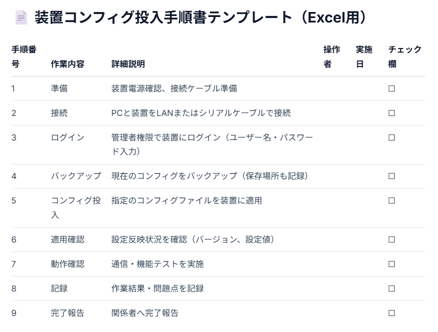 「装置にコンフィグを入れるための手順書テンプレートをエクセルで作成してください」