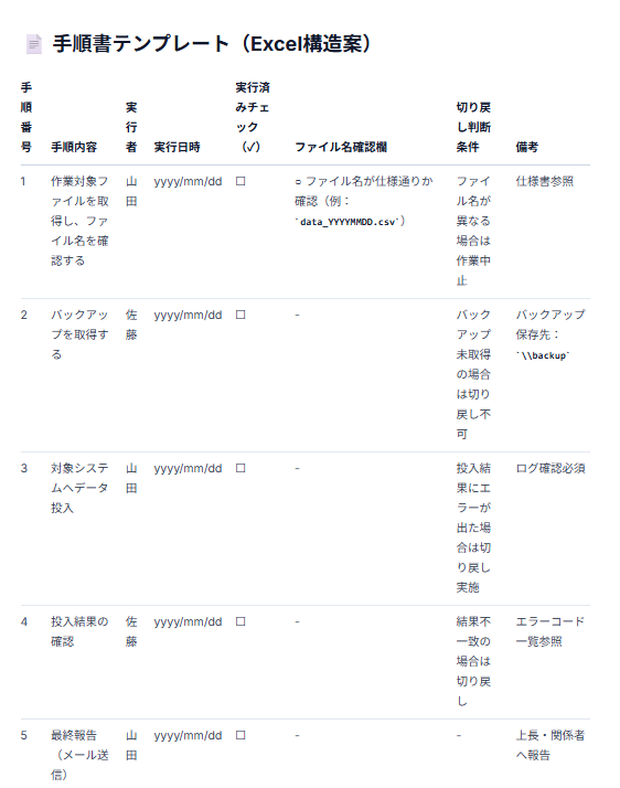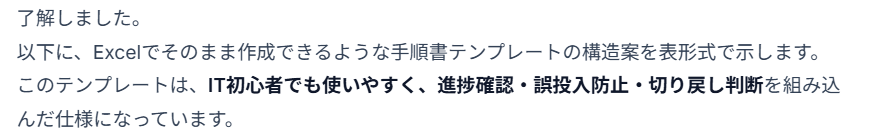 - [目的]:このプロンプトの目的は手順書テンプレートの作成です。