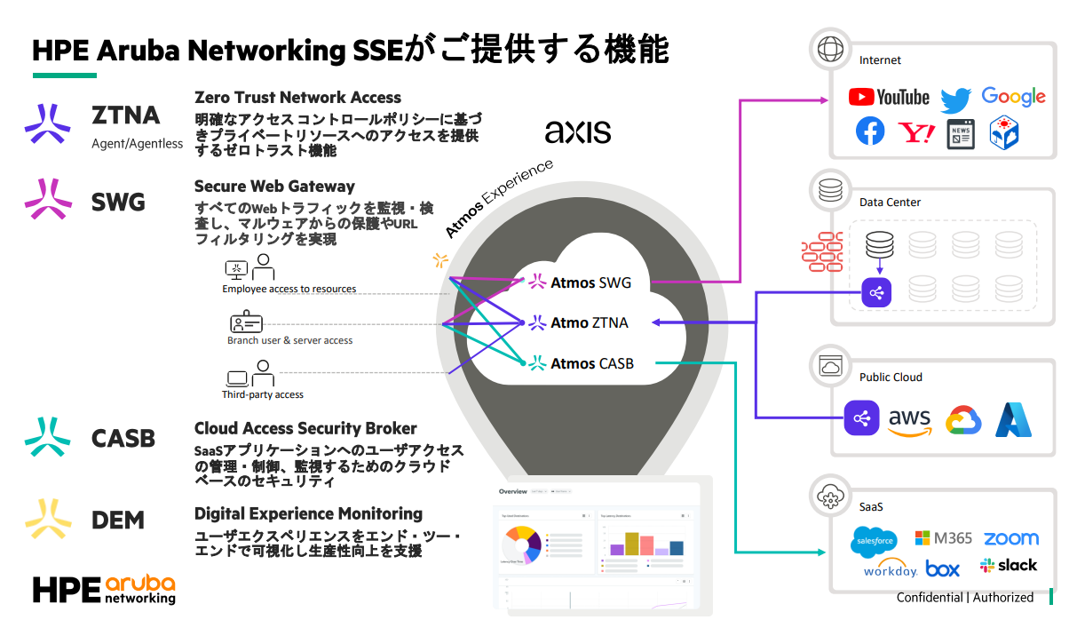 Aruba SSEを扱う上で、「Aruba」や「Axis」という単語が頻出するのは上記の経緯があるためです。Axis Security社はSSEプラットフォーム「Atmos」を開発しており、現在はAruba SSEの重要な技術コンポーネントとなっています。