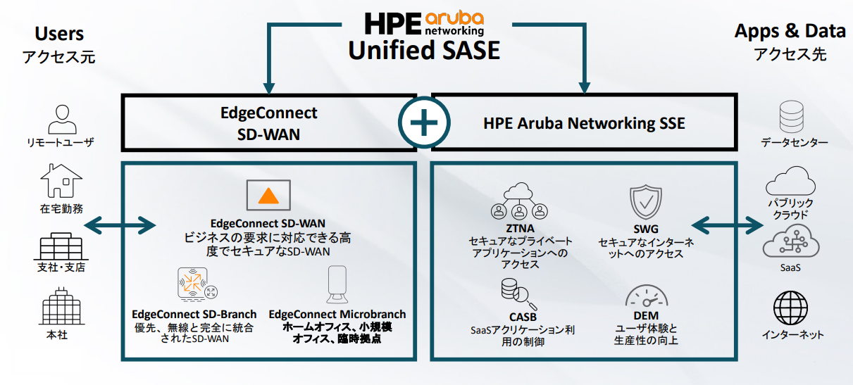 HPE社は、このSD-WAN機能を「HPE Aruba Networking EdgeConnect SD-WAN(以下EdgeConnect SD-WAN)」によって提供しています。Aruba SSEと組みわせることで、単一ベンダによるSASE構成が可能になります。