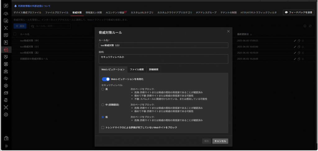 Webレピュテーション > セキュリティレベルを選択する > 保存を選択