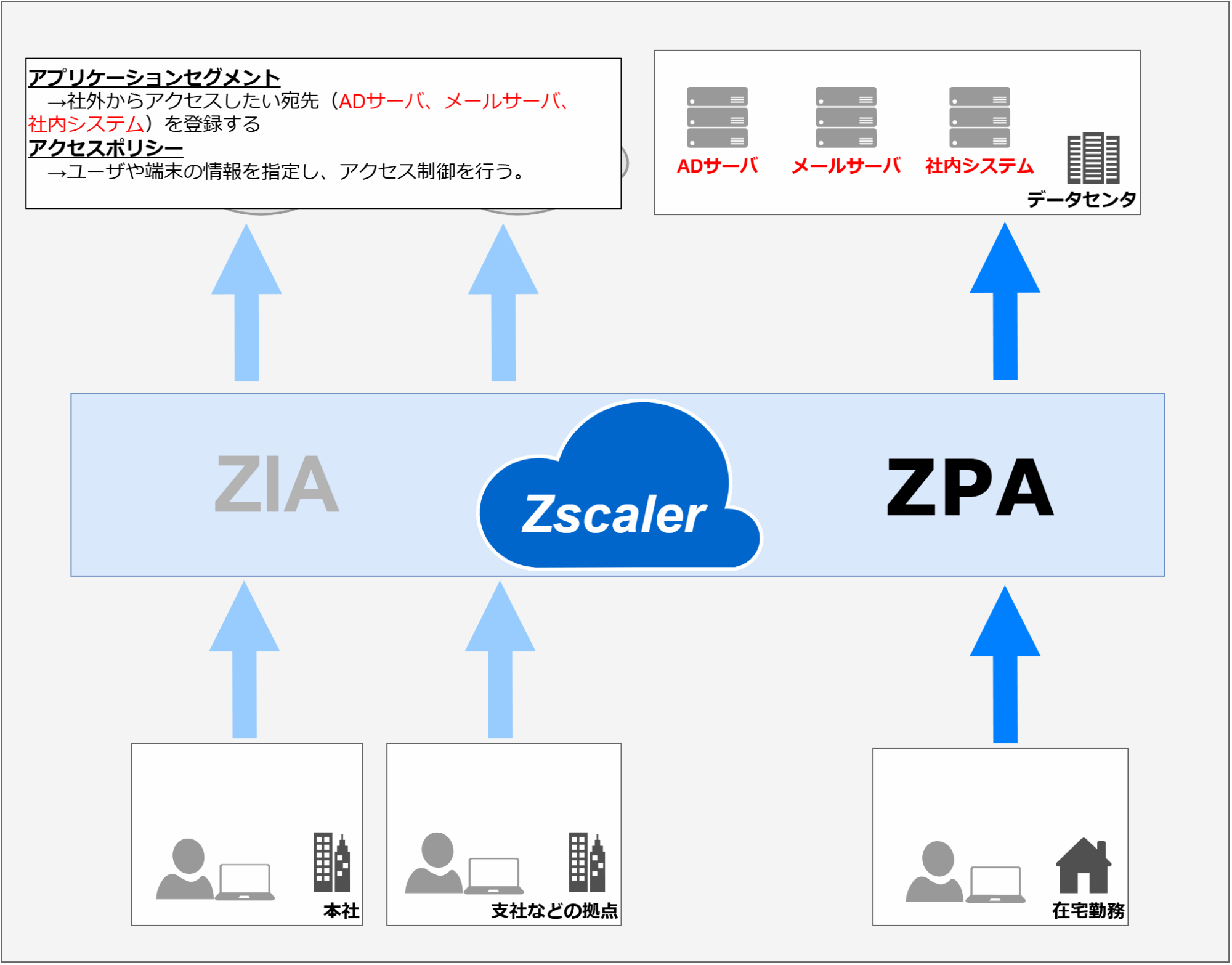 インターネットや社内のシステムへの接続に関するZIA、ZPAはインターネットの内外関係なく、ユーザや端末情報などを確認して通信を許可、拒否するゼロトラストアーキテクチャの考え方に則したものになります。