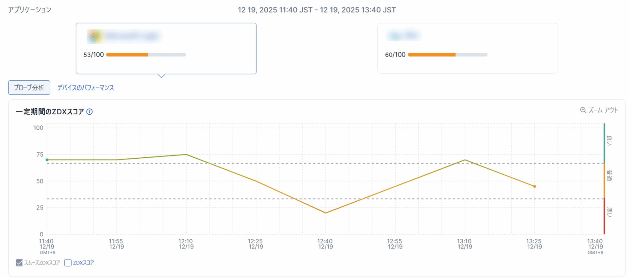実際のZDXスコア画面と特定のWebサイトへの通信パフォーマンス状態の画面は以下になります。