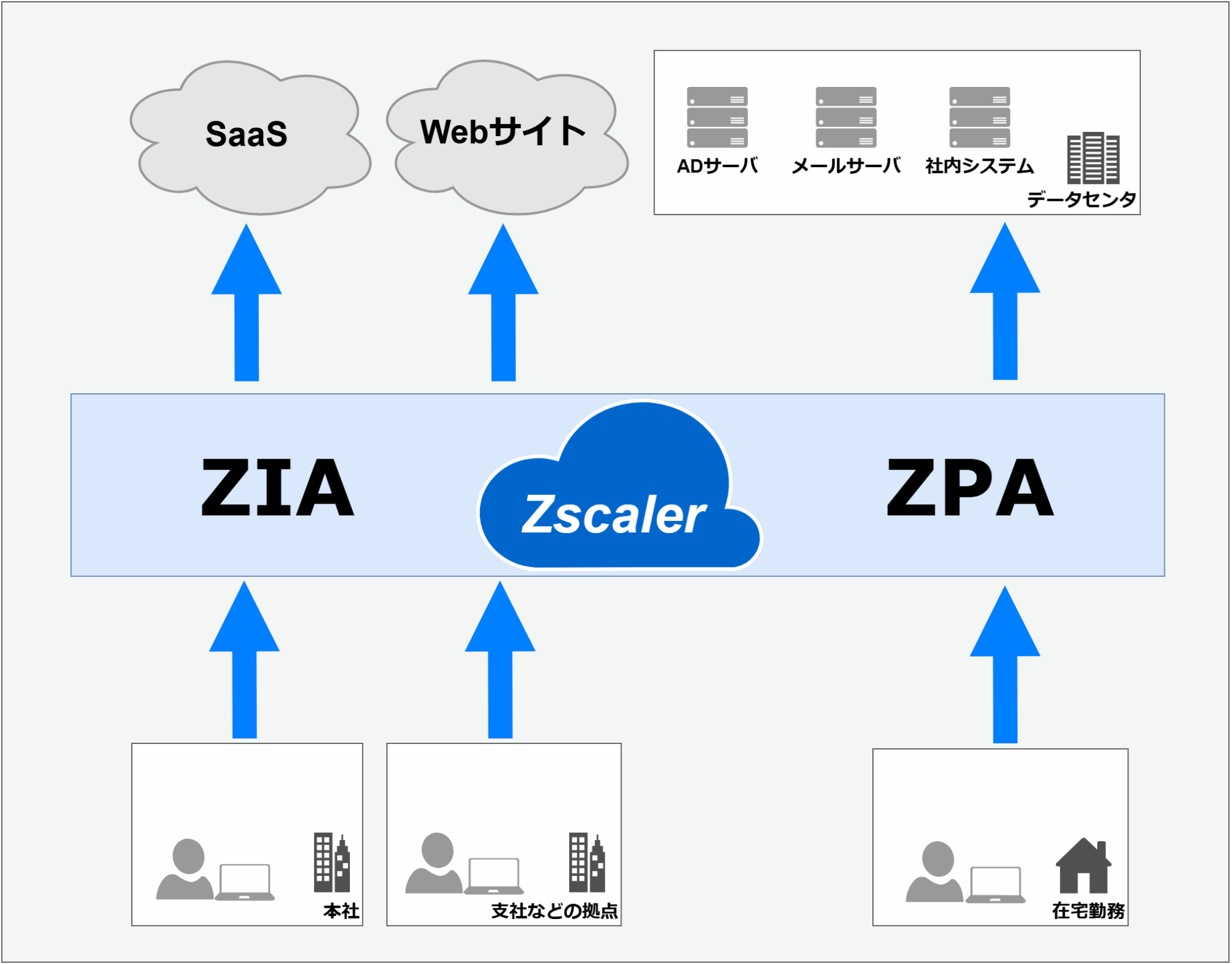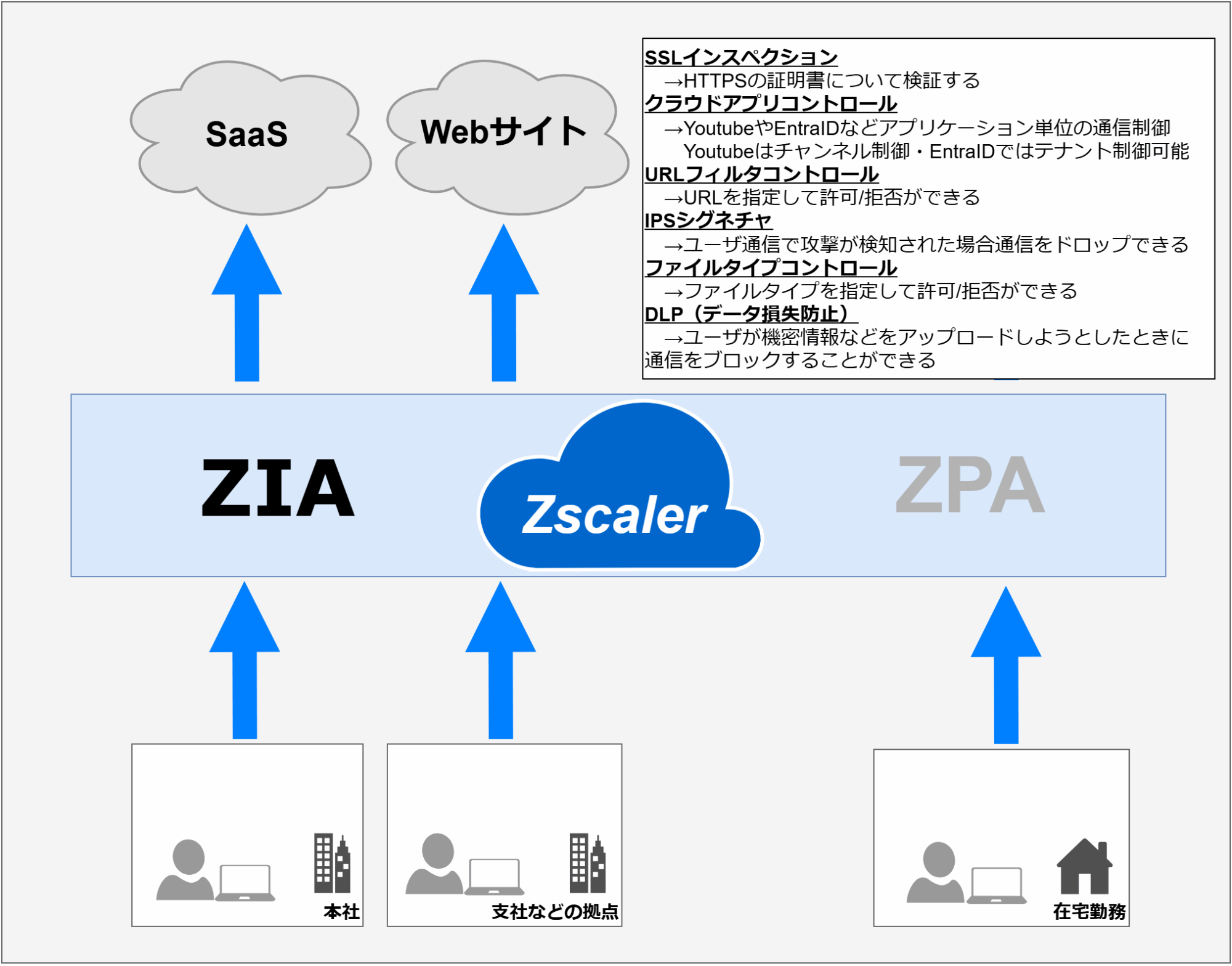 以下の図のようにユーザからインターネットにアクセスする時にはZscaler Internet Access(ZIA)、