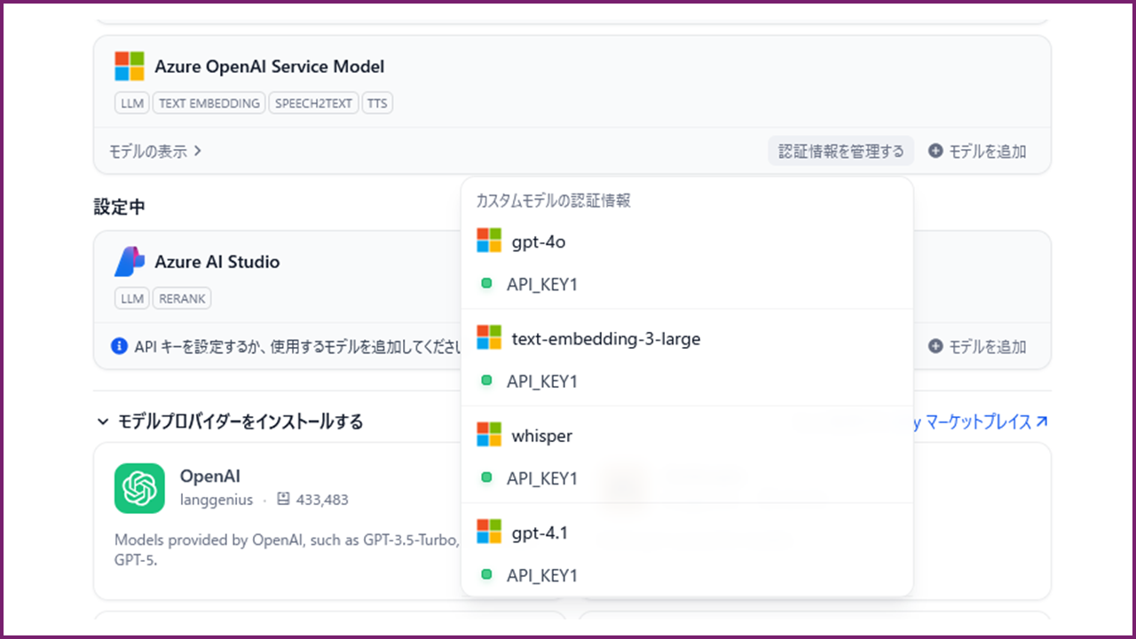 Dify 自体は LLM (Large Language Model, 対話型 AI のコア) の機能は持っておりません。 あくまで LLM などの AI モデルを利用したエージェントの構築プラットフォームです。LLM は別途なんらかの契約で用意してあげる必要があります。用意した LLM を Dify に登録すれば環境作成は完了です。