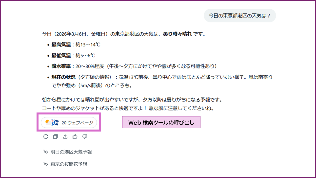つまり、このとき AI は「Web 検索」という道具を使っているのです。AI は裏側で 事前に「君はこういう道具が使えるよ!呼び出し方はこうだよ!」という情報がインプット されており、ユーザーからの指示内容で必要と判断される道具を呼び出して行使することができます。