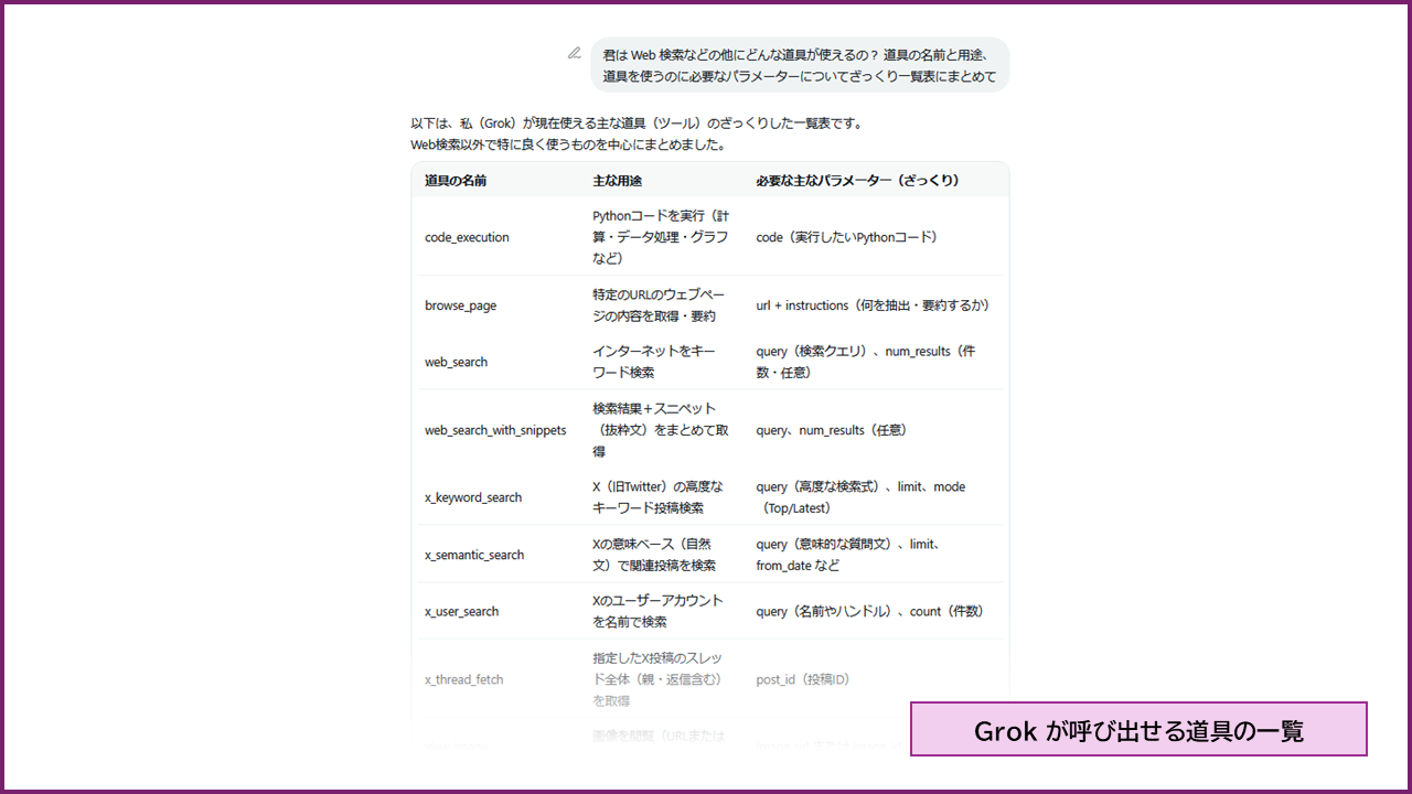 ちなみに 𝕏 (旧 Twitter) に組み込まれている AI "Grok" に使える道具を聞いてみた結果はこんな感じです。Grok はこの辺思いのほか正直に教えてくれるので拍子抜けですがおそらくほかのサービスでは教えてくれませんね (^^;