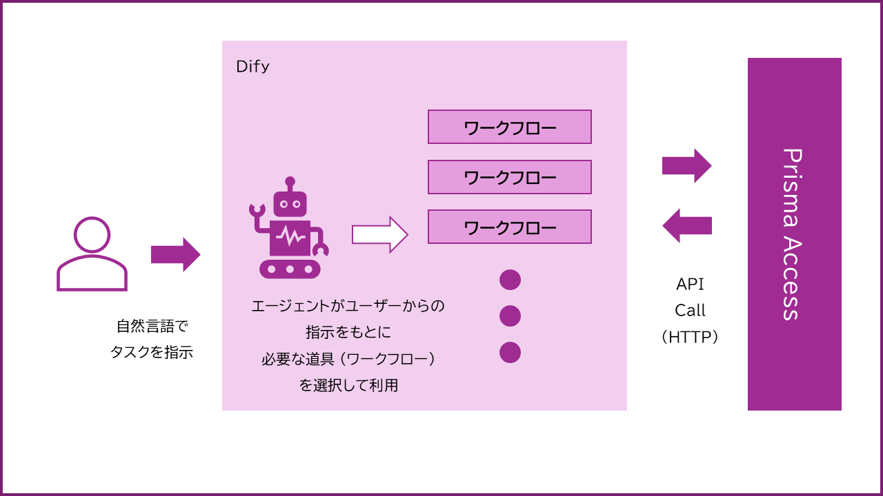 完成イメージは上記の図のとおりです。Prisma Access の各種 API エンドポイントに対して AI 用の道具を用意し、人間からの指示をもとにタスクを完遂できるようにします。