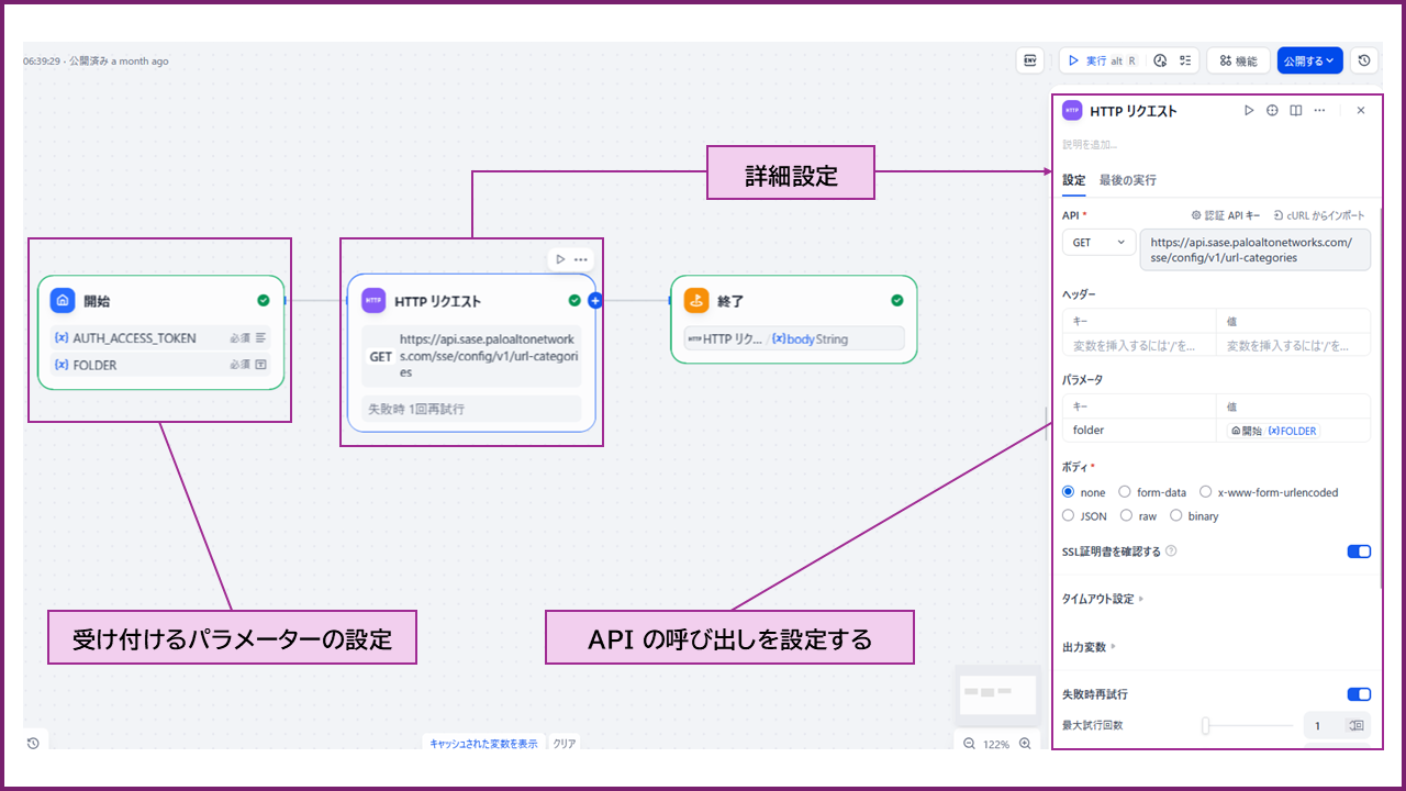 ワークフローは、インプット (パラメーター) とアウトプットを設定することができます。例えば一番最初の認証操作では、クライアント情報をインプットとして受け取り、取得したアクセス トークンをアウトプットとして出力させます。