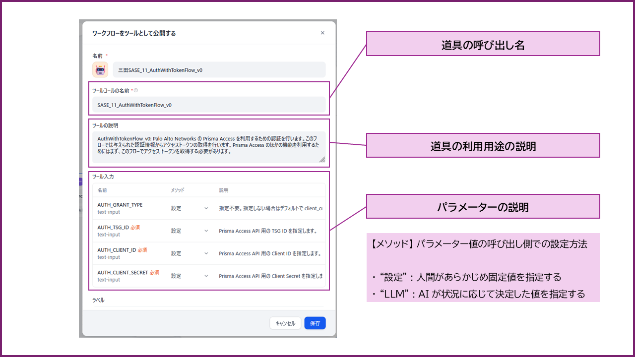 作成したワークフローは、「ツール」として同じ Dify プラットフォーム内で公開することができます (Web 上に公開という意味ではないのでご安心ください) 。その際、そのツールで何ができるのか、インプット (パラメーター) としてどのような値が設定でき、それぞれがどういう意味合いなのかを指定してあげることができます。