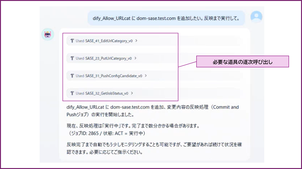 AI がユーザーからの指示を解釈し、どの道具を使えばよいかを自動的に判断してタスクを実行してくれています。特に最初の操作の際には、操作を実際に行う前に特段指示していない認証操作を自発的におこなってくれているのが見えています。